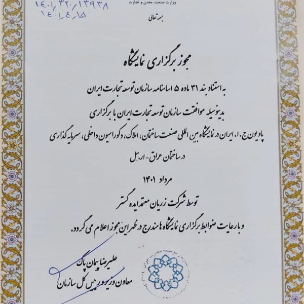 اولین نمایشگاه اختصاصی جمهوری اسلامی ایران در شهر تاریخی اربیل در مورخ 26 تا 29 خرداد سال 1400 هجری شمسی مصادف با 16 تا 20 ژوئن سال 2021 میلادی با حضور بیش از 60 شرکت ایرانی در مساحتی بالغ بر 3000 متر مربع در محل نمایشگاه های بین المللی شهر اربیل پایتخت اقلیم خودمختار کردستان عراق توسط شرکت زریان معتمد ایده گستر برگزار گردید. در این نمایشگاه شرکت های فعال در زمینه های مختلف از قبیل خودرو، ساختمان، مواد غذائی، شوینده و صنایع دستی حضور داشتند که همین تنوع و گستردگی خدمات و محصولات بر جذابیت و تاثیرگزاری نمایشگاه افزوده بود. بزرگترین غرفه نمایشگاه در اختیار شرکت فرش جلالی با مساحت 500 متر مربع فضای نمایشگاهی بود و گرانترین محصول نمایشگاه نیز یک تخته فرش دستبافت به قیمت 11000 دلار، که در همان غرفه به نمایش در آمده بود. در ادامه لیستی از شرکت های حاضر با غرفه های بالای 12 مترمربع را مشاهده می نمائید که لینک خبر حضور آنها در نمایشگاه در سایت اصلی شرکت (در صورت وجود) به نام شرکت متصل شده است. جهت مشاهده بر روی نام شرکت کلیک کنید.
